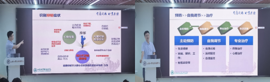报告中,杨乐金结合其临床经验,介绍了心理健康三方面的知识:当前精神障碍在全球和中国的严峻形势及未来面临的挑战;我们如何识别临床常见精神障碍如抑郁障碍、焦虑障碍等疾病的临床特点;在当前的高压力学习环境下,我们学会如何从压力产生的生理机制层面去认知,如何积极主动的预防,自我调节和及时引导自己就医或寻求心理援助。讲座结束后,杨乐金还就如何与精神障碍患者共处,精神医学的科研探索和多学科交叉合作以及如何看待抗抑郁药物的“是与非”等问题与会场的同学进行了精彩互动。