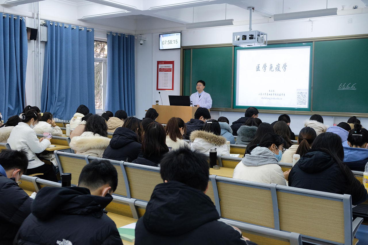 学院党委书记赵福昌听取了朱法良老师讲授的《医学免疫学》课程。课前,赵福昌与朱法良老师进行了交流,询问教学内容、考核方式等。课后,他对朱法良认真的教学态度、生动有趣的教学内容给予了肯定,对全体听课同学饱满的精神状态、认真刻苦的学习态度提出了表扬。