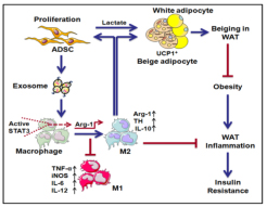 肥胖可诱发脂肪组织炎症、胰岛素抵抗,增加糖尿病、心血管疾病等的患病风险,控制肥胖及相关炎症是防治上述疾病的关键。本研究发现脂肪来源干细胞(ADSC)外泌体治疗可显著减轻肥胖小鼠的白色脂肪组织炎症、胰岛素抵抗和代谢紊乱,并缓解小鼠肥胖的进展和脂肪肝的发生。机制上,ADSC外泌体可通过活性STAT3转录激活精氨酸酶1,诱导抗炎M2巨噬细胞的极化。这类高表达精氨酸酶1的M2巨噬细胞不仅促进ADSC增殖及乳酸的产生,还可高表达限速儿茶酚胺合成的酪氨酸羟化酶,促进白色脂肪的米色化,进而减缓肥胖进展和相关代谢紊乱的发生。该研究首次揭示了外泌体介导的ADSC-巨噬细胞对话及机制,为肥胖以及相关疾病的治疗提供了新的思路和方法。